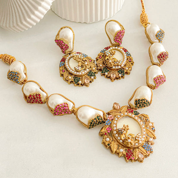 The necklace is composed of elegantly elongated, luminous orbs, each cradled in a miniature, jewel-encrusted cap featuring a mosaic of sparkling, multi-hued crystals. The central pendant is a magnificent oval, showcasing detailed Mughal-inspired artistry set against a milky, ethereal backdrop, framed by delicate pearls and glittering stones. The matching earrings perfectly echo the pendant's intricate motif, uniting the set in a breathtaking display of texture and luminous color.